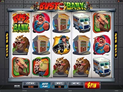 La slot machine Bust The Bank, prodotta dalla Microgaming, ricrea la scena di una rapina in banca, testimoniata dai numerosi simboli presenti: la banda di ladri che fugge con il malloppo, il furgone portavalori, la dinamite usata per creare scompiglio nell’istituto.